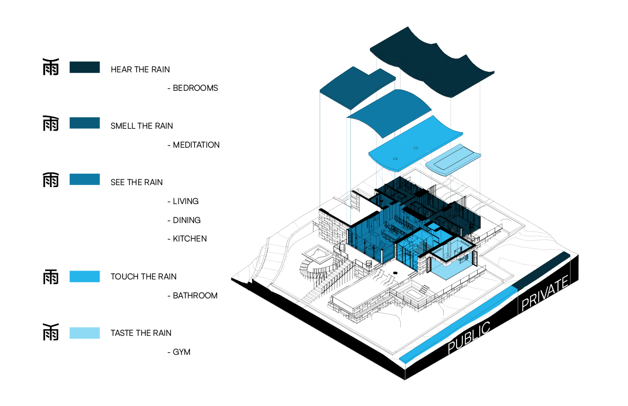 The architectural form of each sense was intentionally placed over the most appropriate spaces within the home. This creates a connection between the sensory experience of the rain and the activity within.