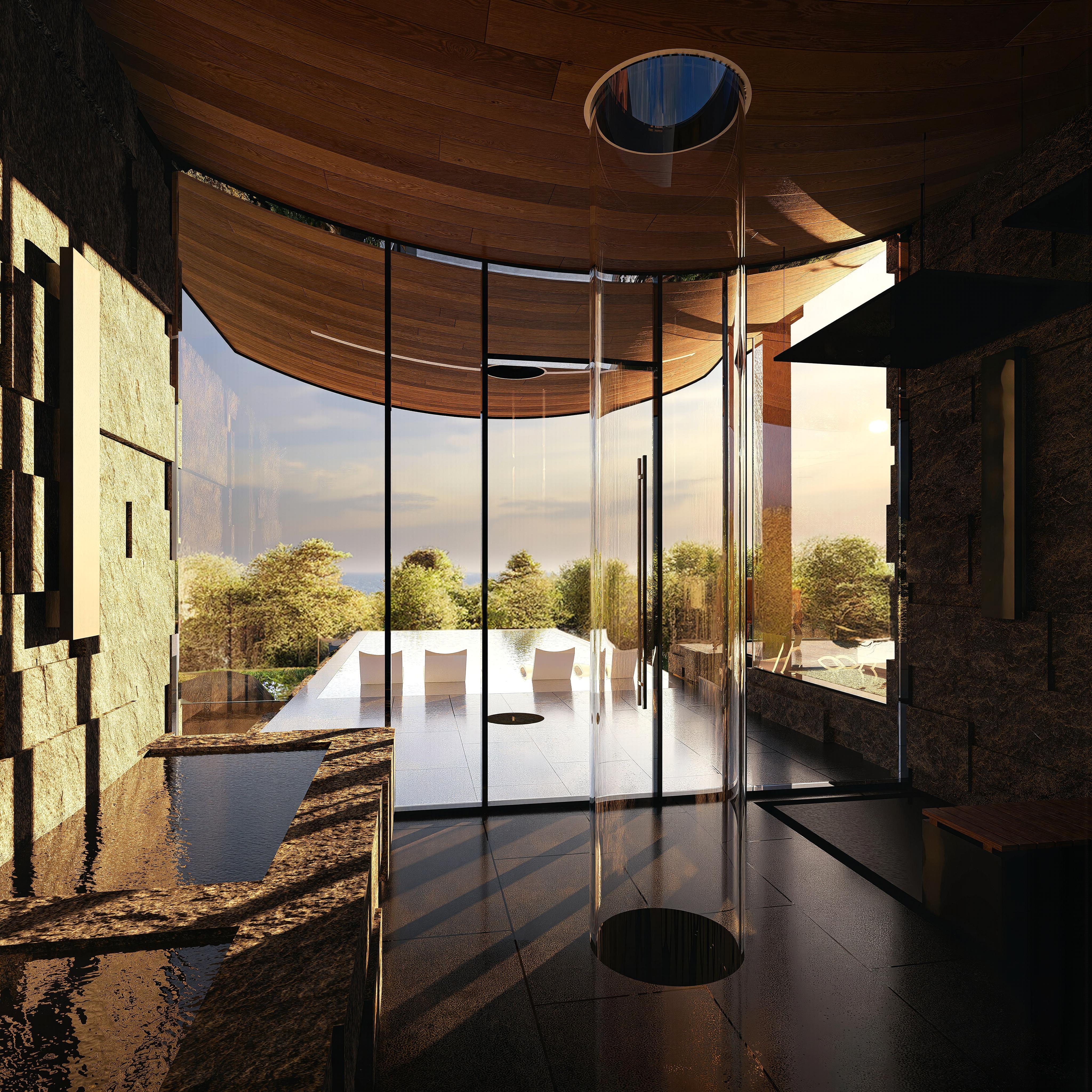Rain brings Feel the Rain to life. In its static form on a clear day, the structure is peaceful and compelling. However, when the rain comes, the building is activated and the energy of the rain is accentuated by the building’s architecture. Swooping curved roofs act as rain collectors to create small waterfalls. The rough cut granite tile exterior cladding highlights the dance of the rain as it flows down the rainwater wall. While, the dry creek bed fills with water from the overflow of the reflecting ponds and surrounds the structure with movement and energy. Inside, the rainwater weathered chimney will rust to show the impact of rain over time. As a result, the Not A Hotel is transformed during a rainfall, and by rainfalls over time.