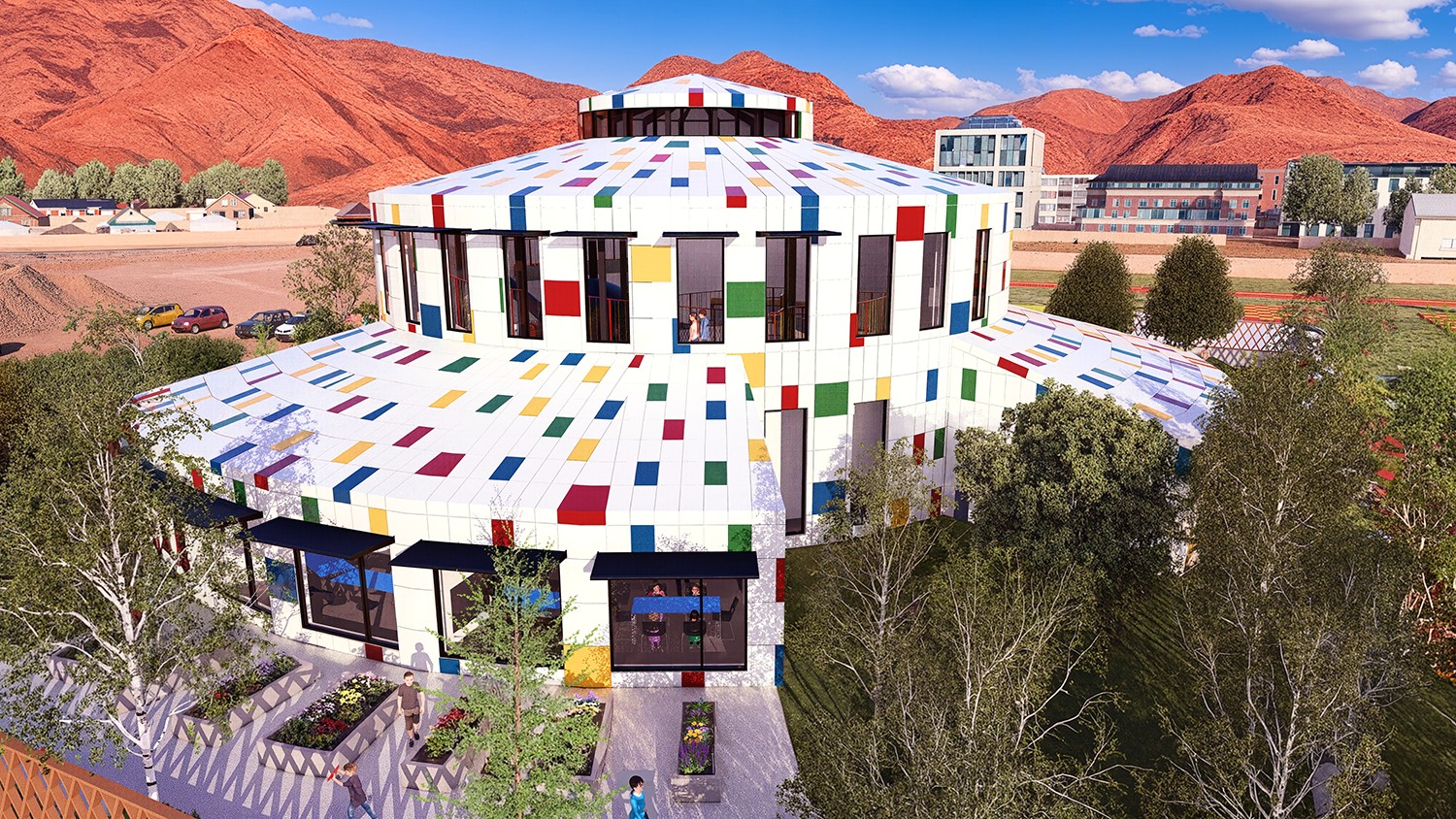 The Garden of Grace Child Development Center was envisioned as a safe haven for the children of Khovd, Mongolia. A place which works to bridge socioeconomic gaps and limitations to create a safe, nurturing space for all children to learn, play and grow. Joint Christian Services (JCS) seeks to build the first indoor, fully accessible playground in the region providing vital space for children during Khovds' harsh cold winters and extreme hot summers. This project was created in collaboration with an incredible multi-disciplinary team of professionals representing Engineering Ministries International (EMI). Together we were able to achieve what equates to months worth of work within a very consolidated timeline. Through careful site analysis, interaction with the local people, investigations of the regions history and architecture an intentional decision was made to derive direct inspiration for the buildings form from the Ger or Yurt, as it is more commonly known. This structure has served for hundreds of years as the common home of the Mongolian people, it still is for many today. However, there was some deliberation about whether utilizing the Ger for direct inspiration would be considered respectful, or potentially inappropriate cultural appropriation. However, we were very glad to find that the local community was honored by the careful consideration of their history and culture and immediately embraced the buildings form. While the Ger serves as the buildings inspiration, careful steps were taken to ensure the design best served the specific programming requirements required by JCS. As a result, the beautifully compelling final form of the building clearly emulates the Ger, whilst having some of its own unique design elements. For example, while Gers are commonly white, a space meant for children would not be complete without the addition of splashes of color on the facade to ensure the building presented a playful element.