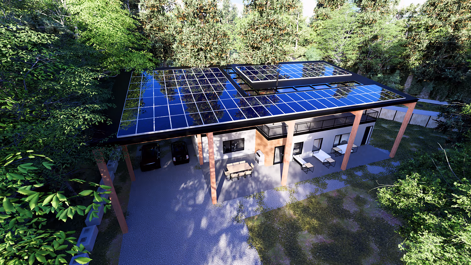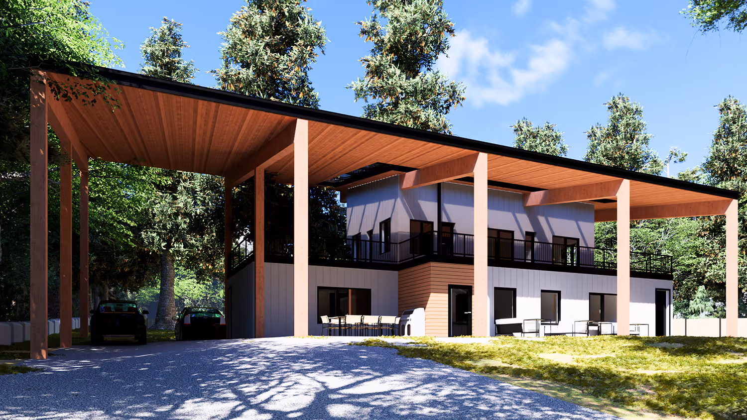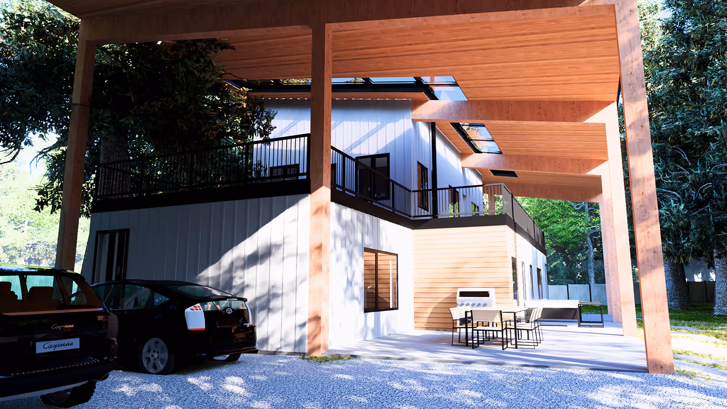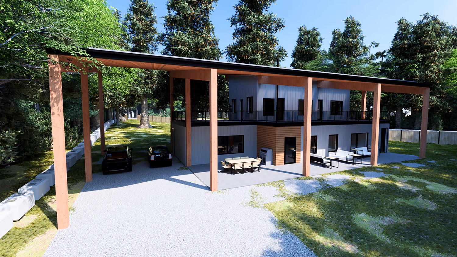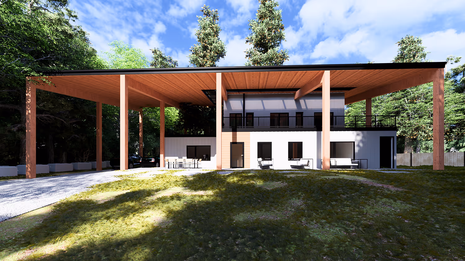 The Rain Passive House is designed as a passive house complete with its own rainwater catchment system. The site does not have local infrastructure readily accessible for water supply. As a result, the design was driven by the need to create a large enough roof surface to capture the required amount of rain to support the home. This manifested into the heavy timber column and beam superstructure which supports the large mono-slope roof above. The roof also supports a large rooftop solar array. The program for the home consists of a 2-story single family home with public spaces on the main floor and private spaces on the second floor. The large rooftop and superstructure will allow for future flexibility to the homes design if the client ever desires to extend their home over the second floor rooftop decks.
